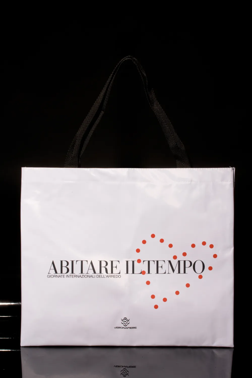 Busta shopper in nylon impermeabile, con manici lunghi in nastro grosgrain, personalizzabile, con stampa serigrafica, fino a 4 colori.