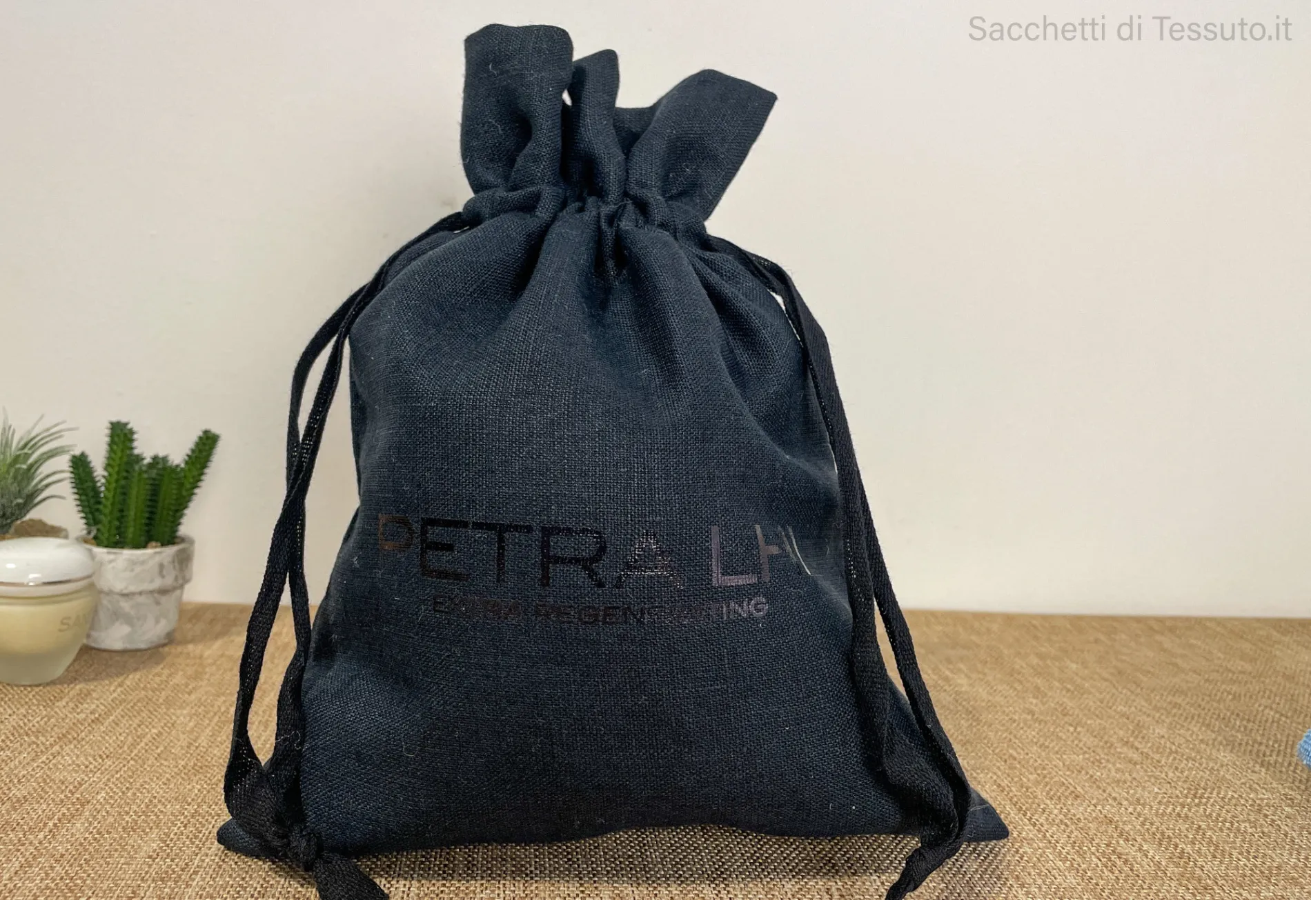 Sacchetto in puro lino nero , con chiusura a caramella con 2 nastrini in cotone.