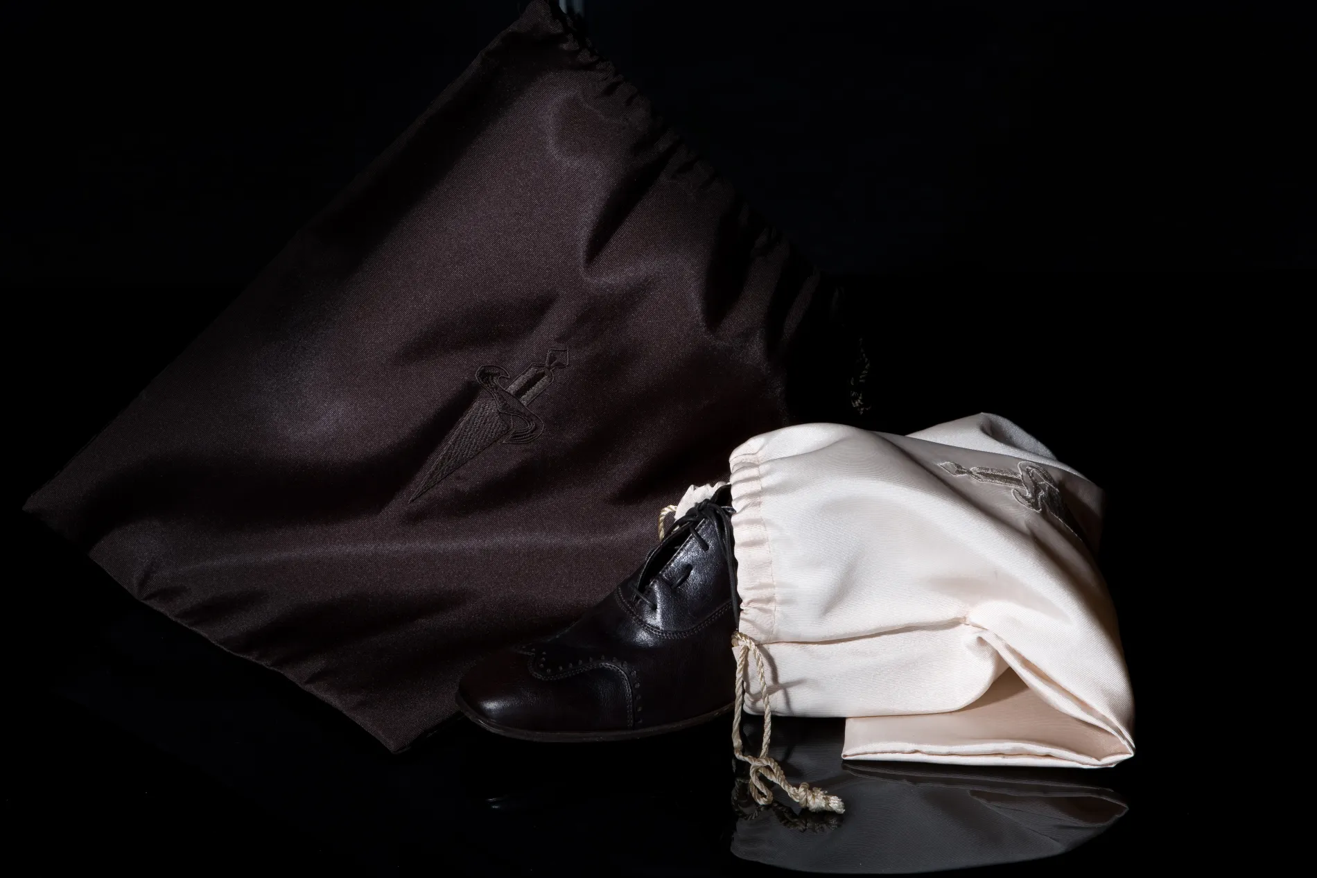 Sacchetto per calzatura in tessuto ottoman lucido, chiusura a coulisse 2 corde ritorte in cotone, personalizzato con logo ricamato su tessuto.
